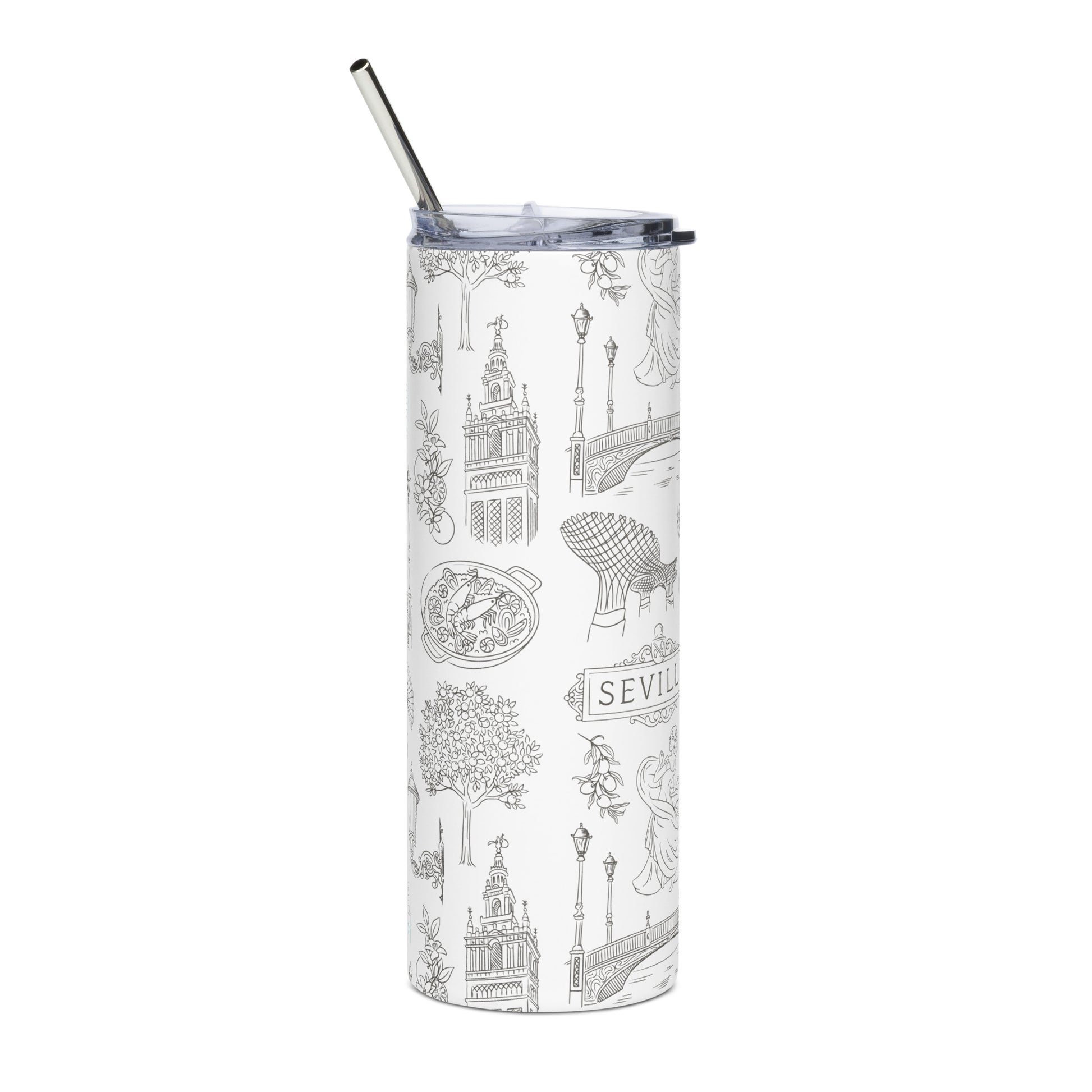 Enjoy hot or cold drinks on the go with this stainless steel tumbler! Stylish, functional, and a true homage to Seville's allure, this tumbler is the ideal companion for travelers and a thoughtful gift for those who hold this city close to their hearts.